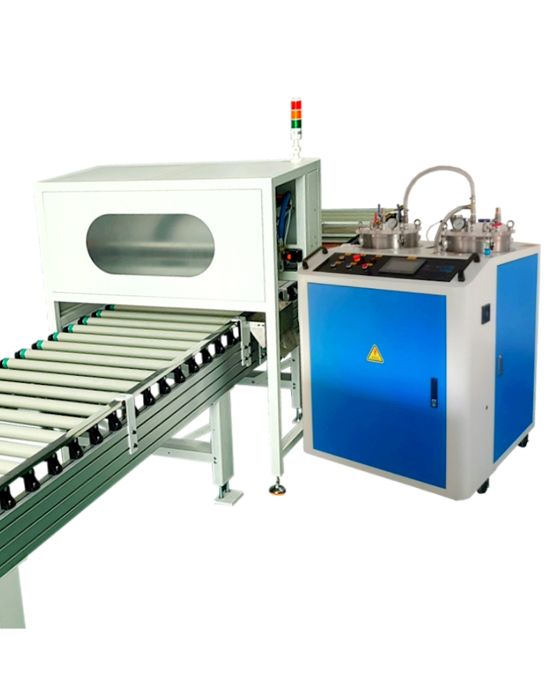 双组份环氧树脂淋胶机主要用于将双组份环氧树脂A、B胶混合料均匀快速淋涂在较大幅面的板材粘合面,如房车车厢板、冷藏车厢板、防火门、保温板、岩棉防火板、铝蜂窝板等。设备采用PLC编程控制,智能触摸屏操作,设备操作简单易学。两个储料罐分别单独存储A、B两组份胶料;根据根据胶料的性能和工艺要求,可对料罐内的胶料进行加温(降低粘度,使其流动性更好)、搅拌(防沉淀、保证料温均匀)、抽真空(真空脱泡、真空保存原料)等一些列预处理。根据胶料的性能及工艺流量要求匹配适合的计量泵浦,计量系统采用步进电机驱动进口精密计量泵浦实现A、B胶的精确计量和连续、稳定供料。静态混合器及专用定制淋胶头保证混合淋涂均匀。