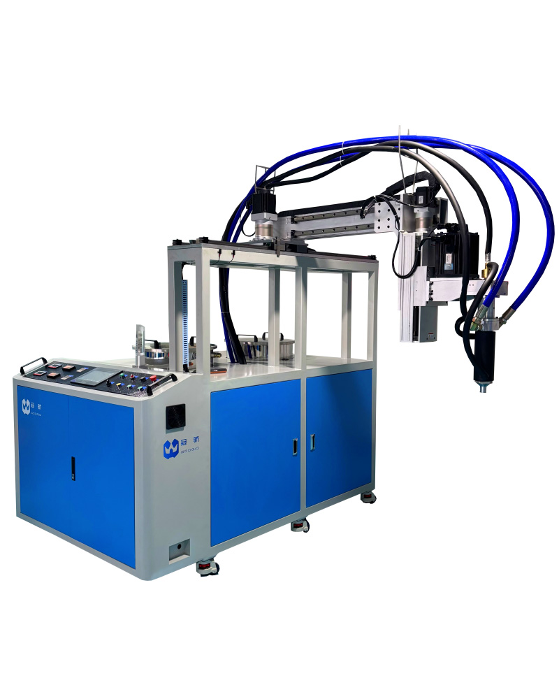 液态硅胶泡棉生产设备主要应用于液态硅胶泡棉压延生产工艺中双组份高粘度液态发泡硅胶的自动计量、配比、混合及连续定量供料。设备采用PLC编程控制,智能触摸屏操作,操作简单易学。根据根据胶料的性能和工艺要求,料罐、计量泵、出料管、搅拌杯、搅拌轴等关键节点均做制冷恒温控制。设备计量系统采用精密伺服电机和进口高粘度填充料专用计量泵浦;计量精度高,稳定性好,可连续长期稳定供料。带专利保护的自动循环高速动态硅胶发泡枪头,保证实现主剂和固化剂的均匀混合。
