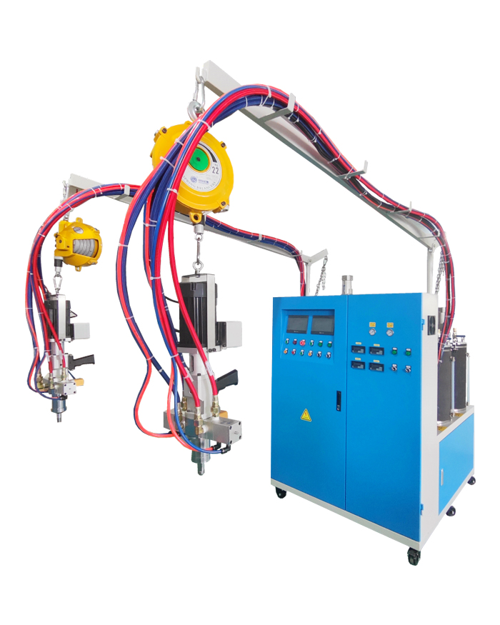 双枪头聚氨酯发泡机主要适用于聚氨酯黑白料的自动配比混合及定量灌注。该设备配套有四个独立的储料罐、四套独立的计量系统、两套独立的控制系统及两把独立的混合灌注枪,可同时生产两种不同颜色或硬度的聚氨酯发泡制品。设备采用 PLC 编程控制,智能触摸屏操作,操作简单易学。设备配备有液位监测、压力监测、加热、搅拌、自动循环、故障报警等功能组件。计量系统采用精密伺服电机和进口精密计量泵浦;计量精度高,稳定性好,可连续长期稳定供料。定制高速动态混合枪头,保证实现 A、B 两组份的均匀混合。