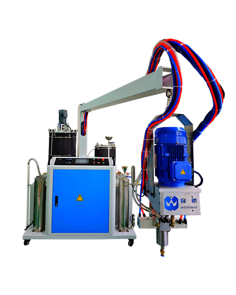 硬泡聚氨酯(PU)发泡机用于聚氨酯硬泡制品生产工艺中双组份聚氨酯黑白料的自动计量、配比、混合及定量灌注。设备采用 PLC 编程控制,智能触摸屏操作,操作简单易学。设备配备有液位监测、压力监测、加热、搅拌、自动循环、故障报警等功能组件。计量系统采用精密伺服电机和进口精密计量泵浦;计量精度高,稳定性好,可连续长期稳定供料。定制高速动态混合枪头,保证实现 A、B 两组份的均匀混合。
